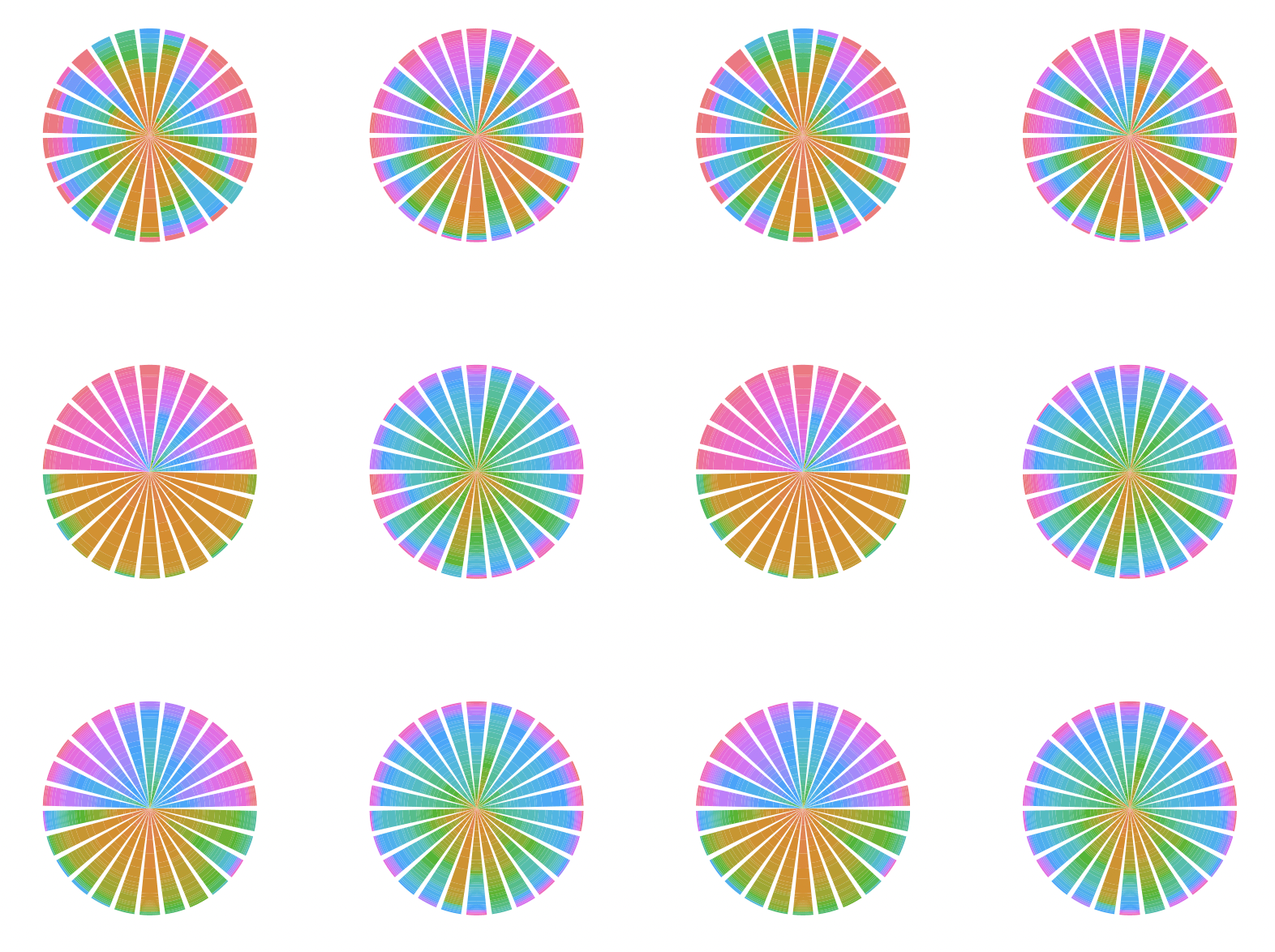 Depicted as a flower, the “petals” indicate the range and quality of nine individuals’ emotional experiences for each emotion, high arousal positive valence (enthusiasm) in the top right quadrant and moving clockwise through low arousal positive (calm), low arousal negative (sad), and high arousal negative valence (angry) emotions. Colors indicate the proportion of reports of low (blue) to high (pink) intensity. The small bouquet prompts consideration of the diversity of individuals’ unique daily lives – their sadness, anxiety, anger, joy, happiness, and many in-betweens.