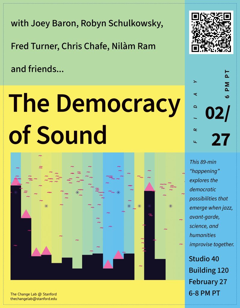 The Democracy of Sound. February 27 2026 6:00 PM PT. Building 120, S40. with Joey Baron, Robyn Schulkowsky, Fred Turner, Chris Chafe, Nilam Ram, and friends...